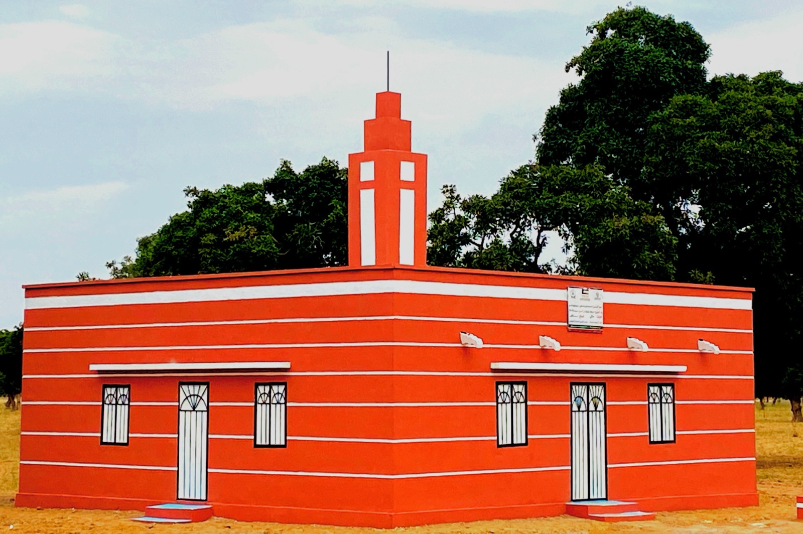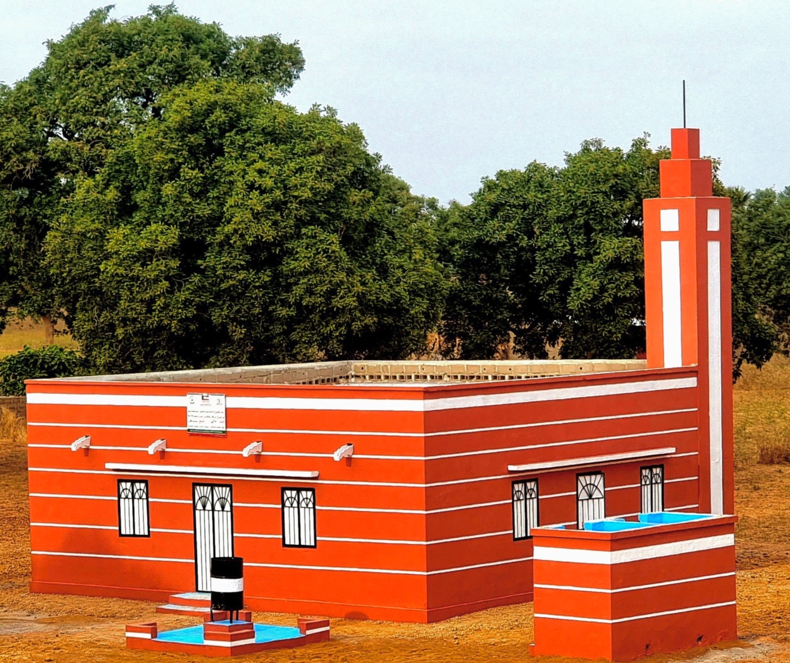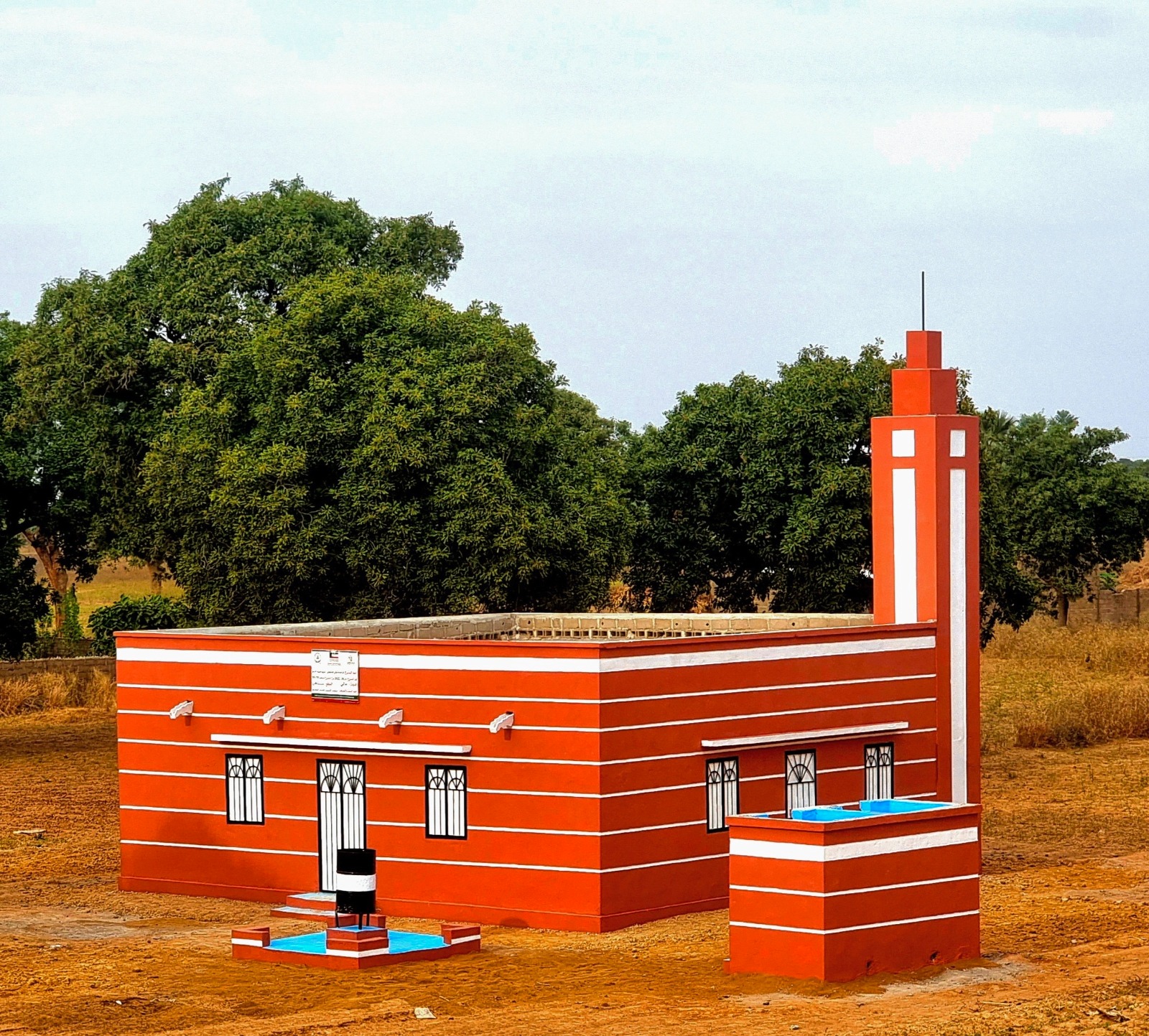 نموذج بناء مسجد 100 متر مربع في مالي بالطوب والاسمنت والحديد والخرسانة المسلحة مسقف بالزنك والخشب العازل للحرارة، مع التجهيز ودورات مياه تسع لعدد 160 مصل بتكلفة 4500 د.ك