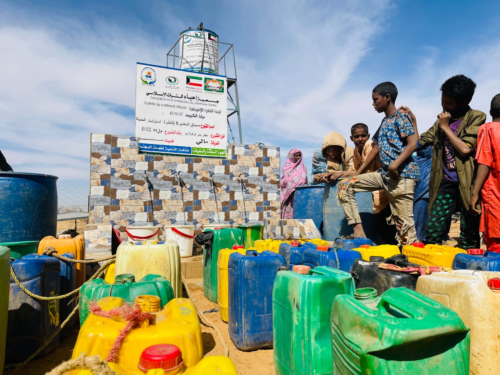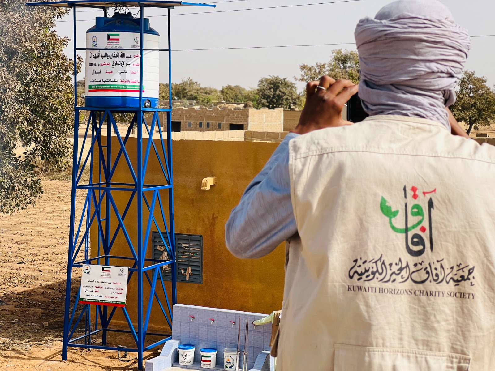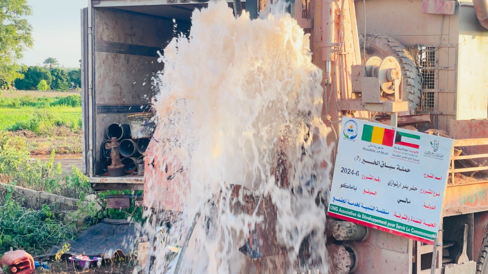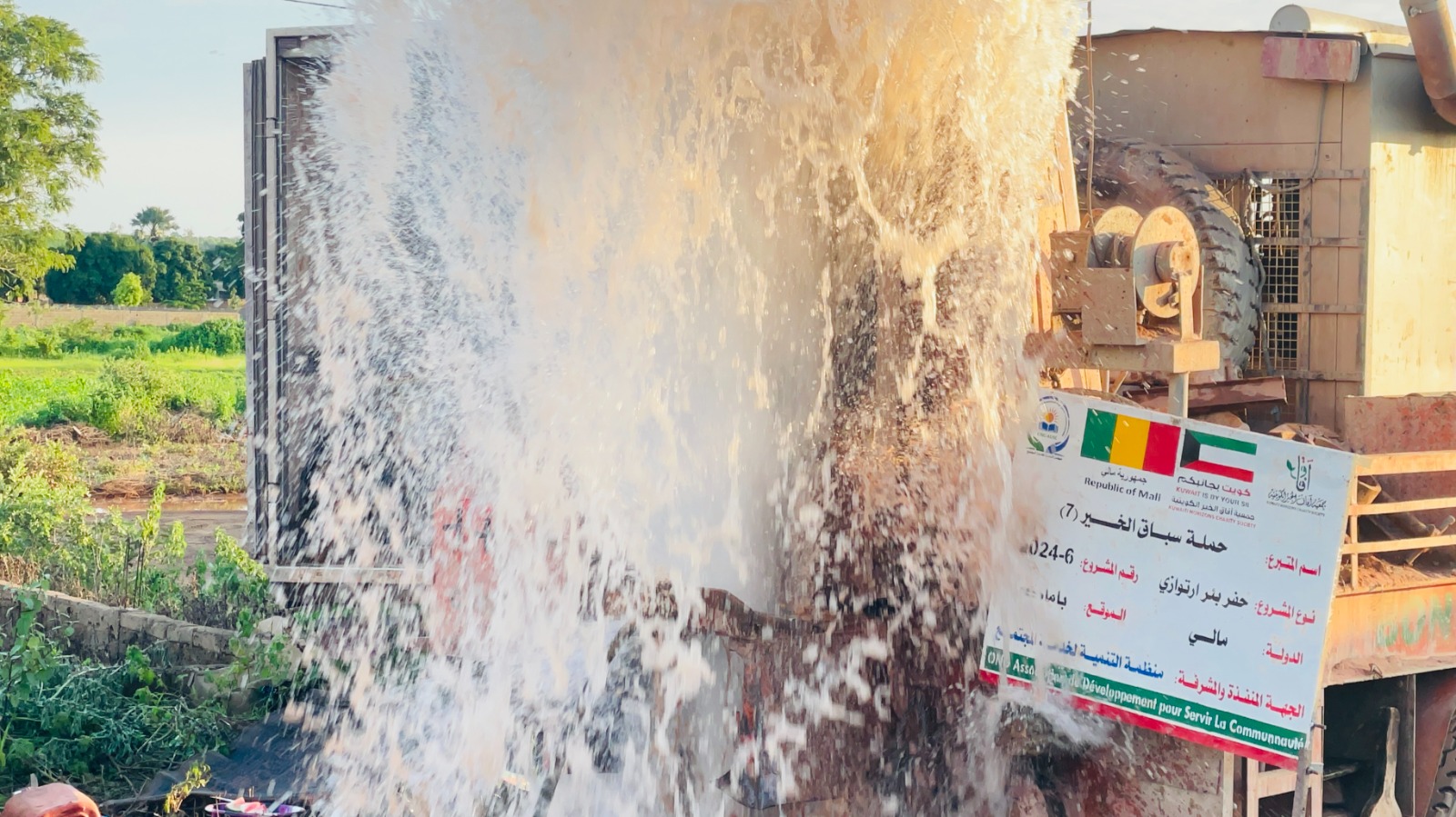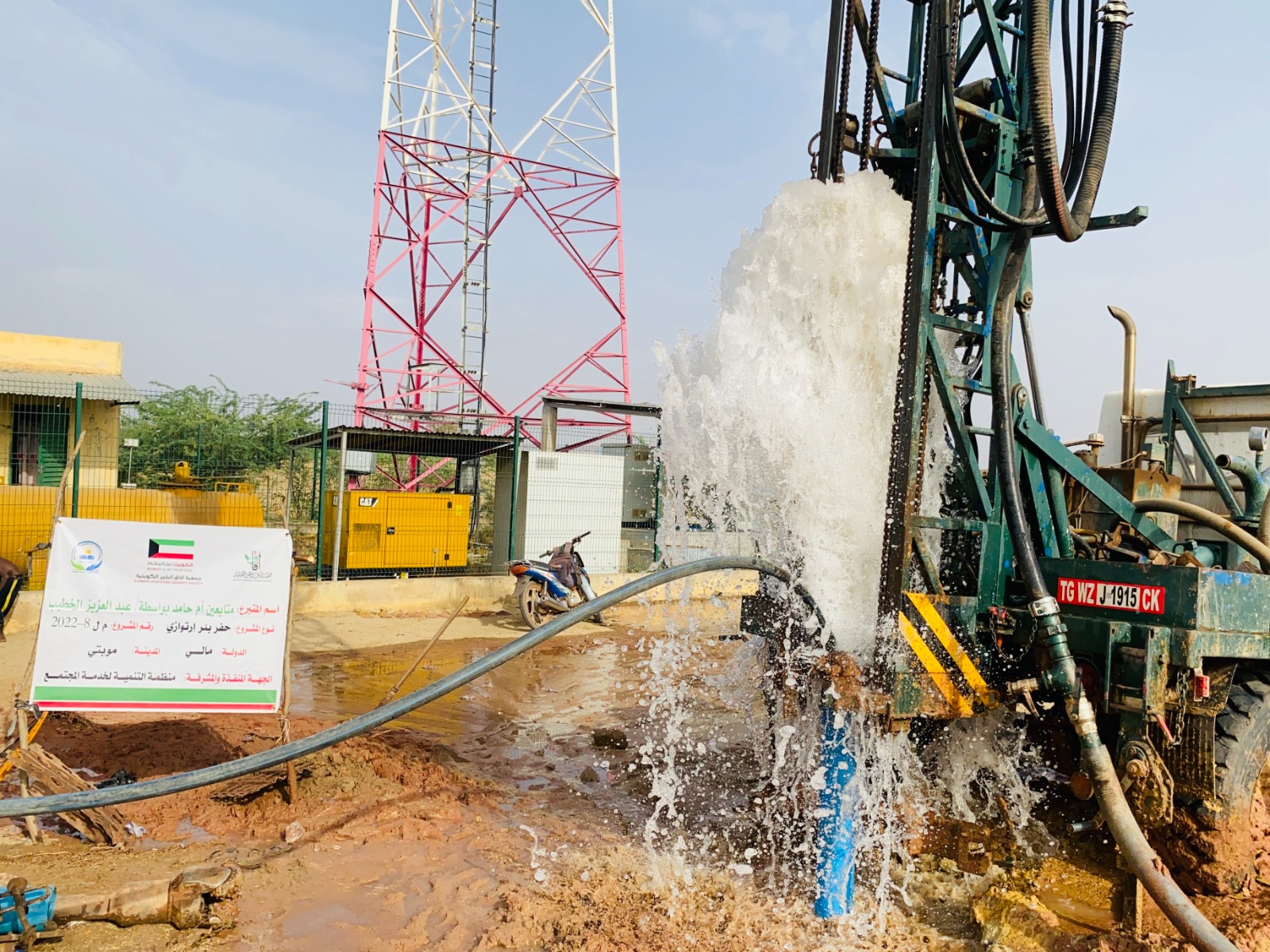 بئر ارتوازي يتم بواسطة حفار آلي مع ملحقاته خزان ماء بلاستيكي يسع 5000 لتر + أنابيب + مضخة كهربائية طاقات شمسية بعمق يتراوح من 60 إلى 80م3 يكفي لعدد 3 قرى بتكلفة 6000 د.ك