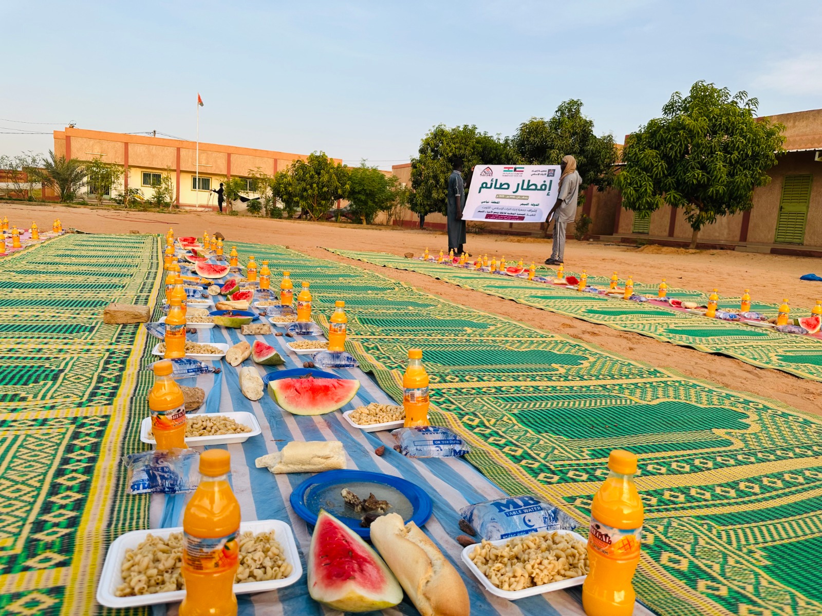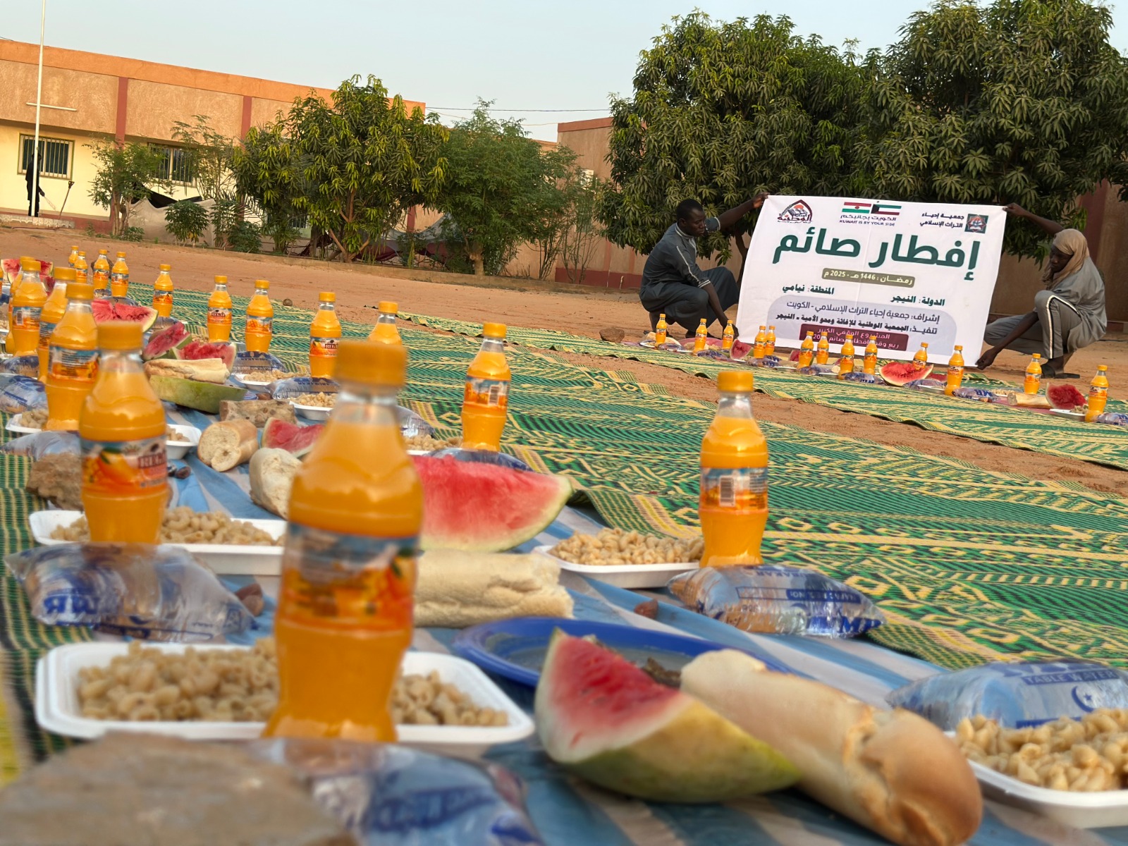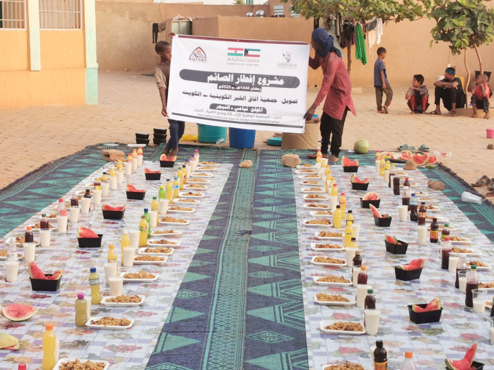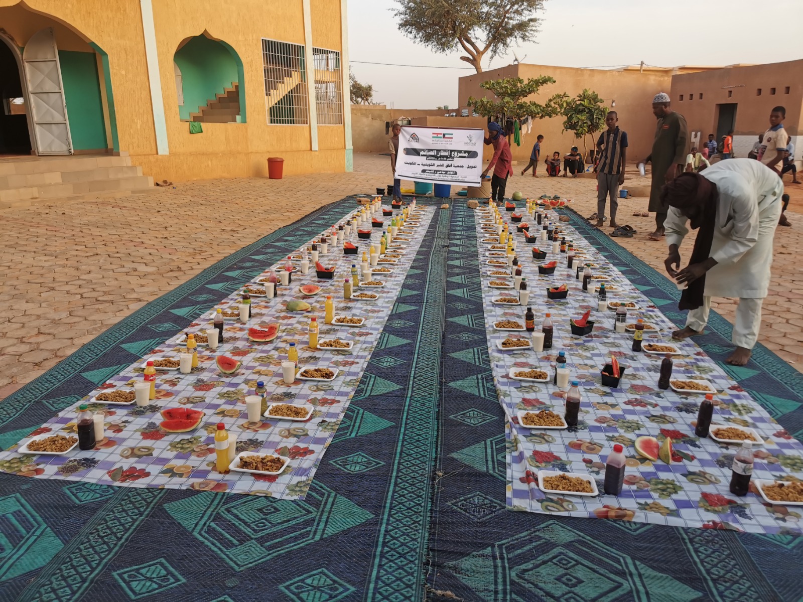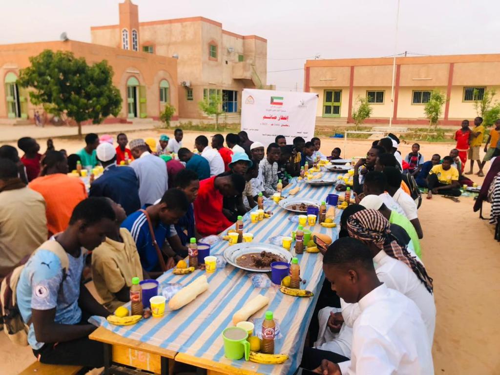 عمل موائد الإفطار في الأحياء الشعبية مكونات الوجبة: مكرونة، واللحم، والفاكهة، والخبز، والعصير، وتمر، والماء البارد بتكلفة: 0.5 دينار كويتي