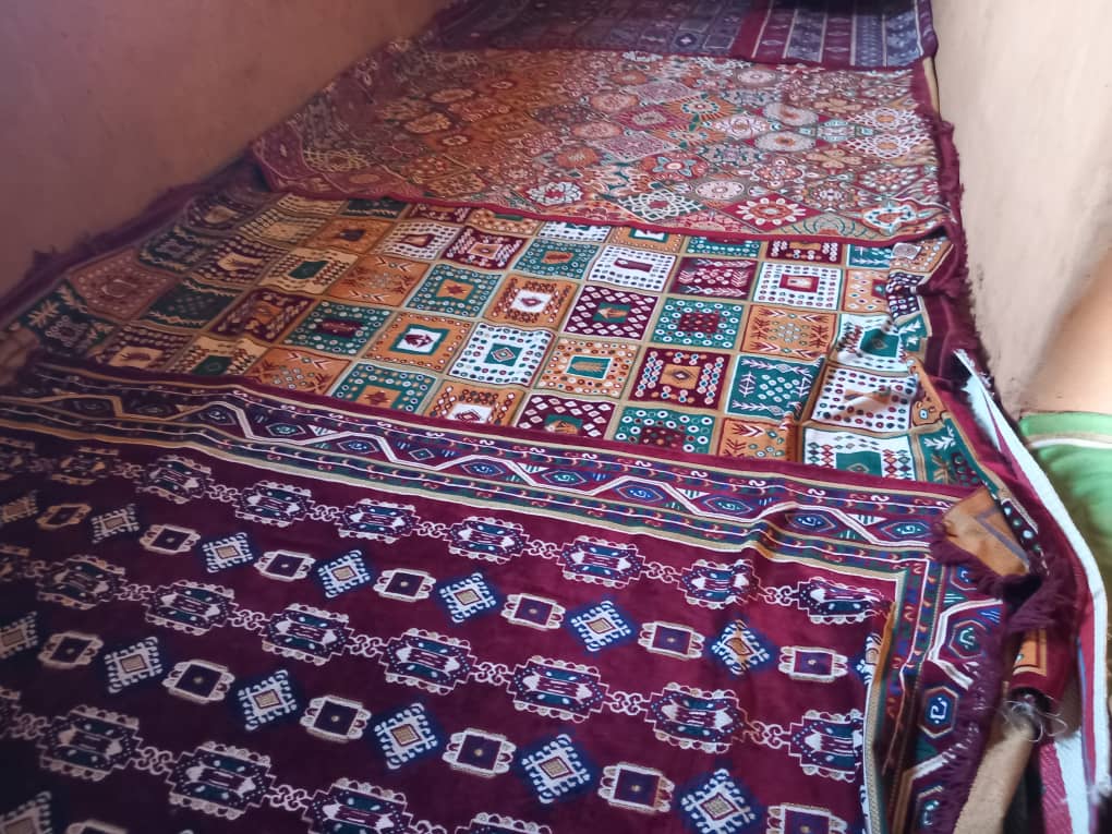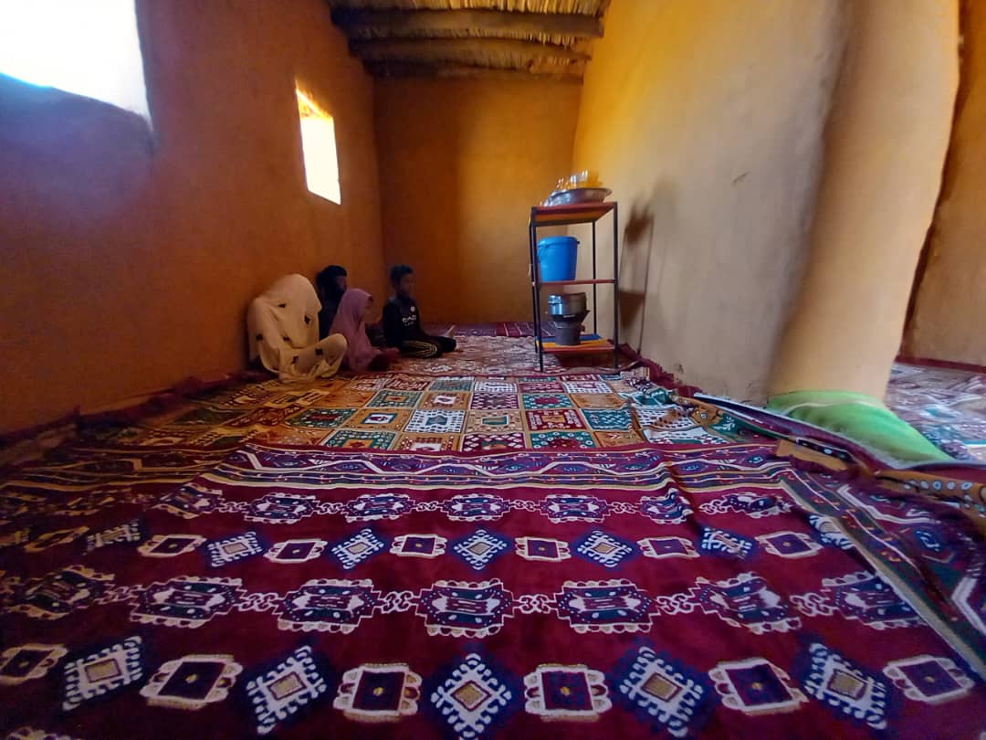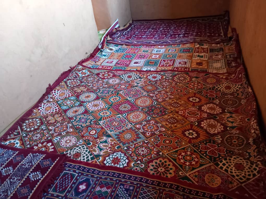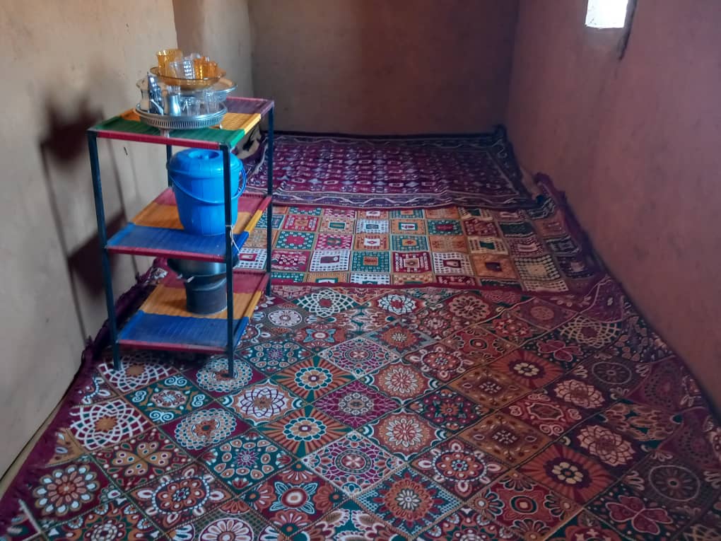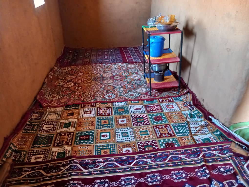 السقف بدائي من الاخشاب والطين مع التجهيز بالحصير واواني الطبخ.